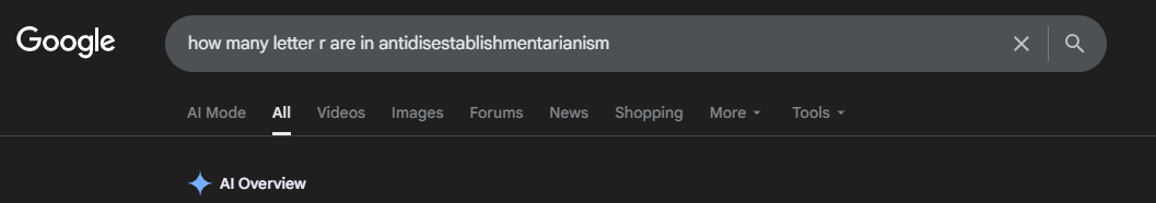 There is only 1 letter r in antidisestablishmentarianism.